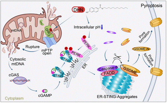 本研究阐明:1)DHN通过靶向CypD诱导mPTP持续开放,促使mtDNA释放并激活cGAS;2)DHN引发的胞内酸化激活PERK介导的STING磷酸化,促进STING形成聚集体,为Caspase-8/GSDME提供作用平台。更重要的是,该研究揭示了cGAS-STING通路的非经典功能:当cGAS被激活且胞内pH降低时,可诱导GSDME依赖性细胞焦亡。该研究为肿瘤治疗提供了新靶点和先导化合物。