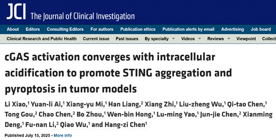 近日,福建省药物新靶点研究重点实验室、taptap点点苹果下载药学院李福男团队,联合生命科学学院吴乔、陈航姿、邓贤明团队,成功开发出小分子十二烷基6-羟基-2-萘酸酯(DHN),可通过非经典cGAS-STING通路诱导GSDME依赖性细胞焦亡。该研究不仅拓展了我们对细胞焦亡调控网络的认识,更为肿瘤治疗提供了新靶点和先导化合物。相关研究成果以“cGAS activation converges with intracellular acidification to promote STING aggregation and pyroptosis in tumor models”为题发表于 The Journal of Clinical Investigation期刊。